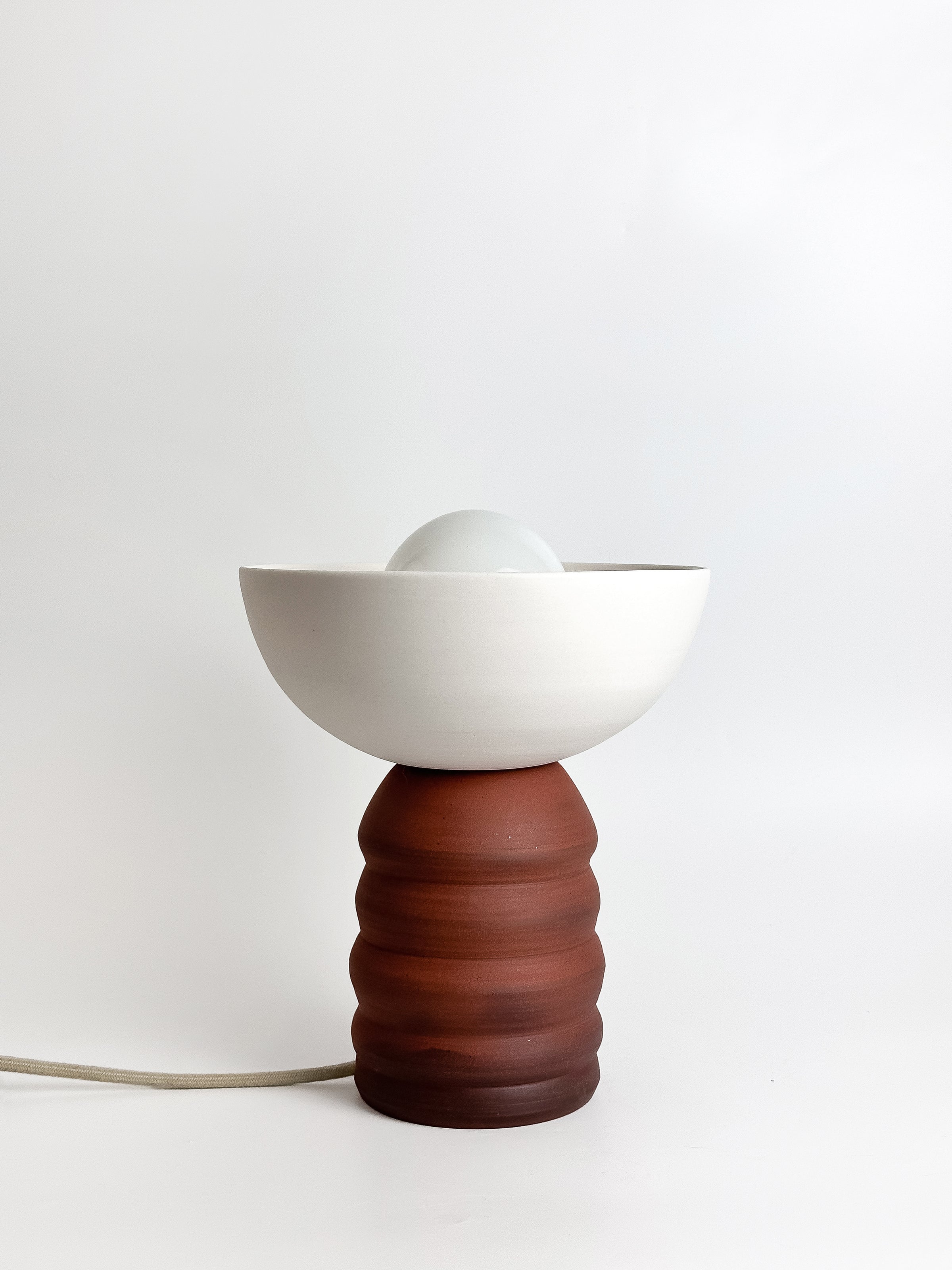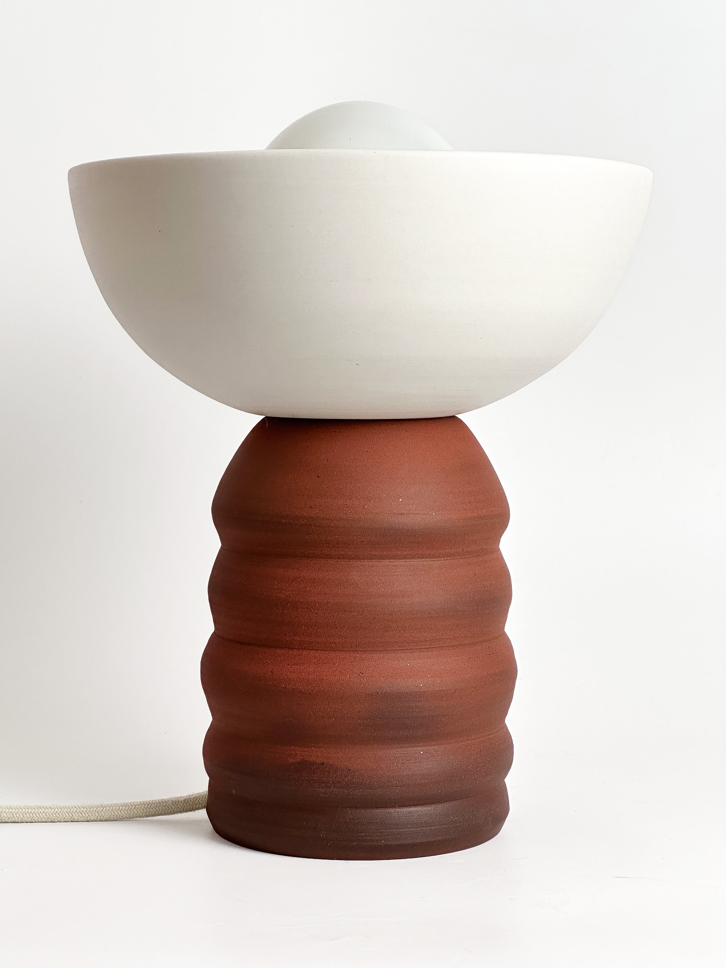 A porcelain and rust stoneware table lamp, handmade with care. The CRESCENT lamp features a translucent porcelain shade that emits a distinctive, gentle glow when illuminated. It's perfect as an accent piece, for reading, on a bedside table, or anywhere that calls for warm, beautiful ambient light.