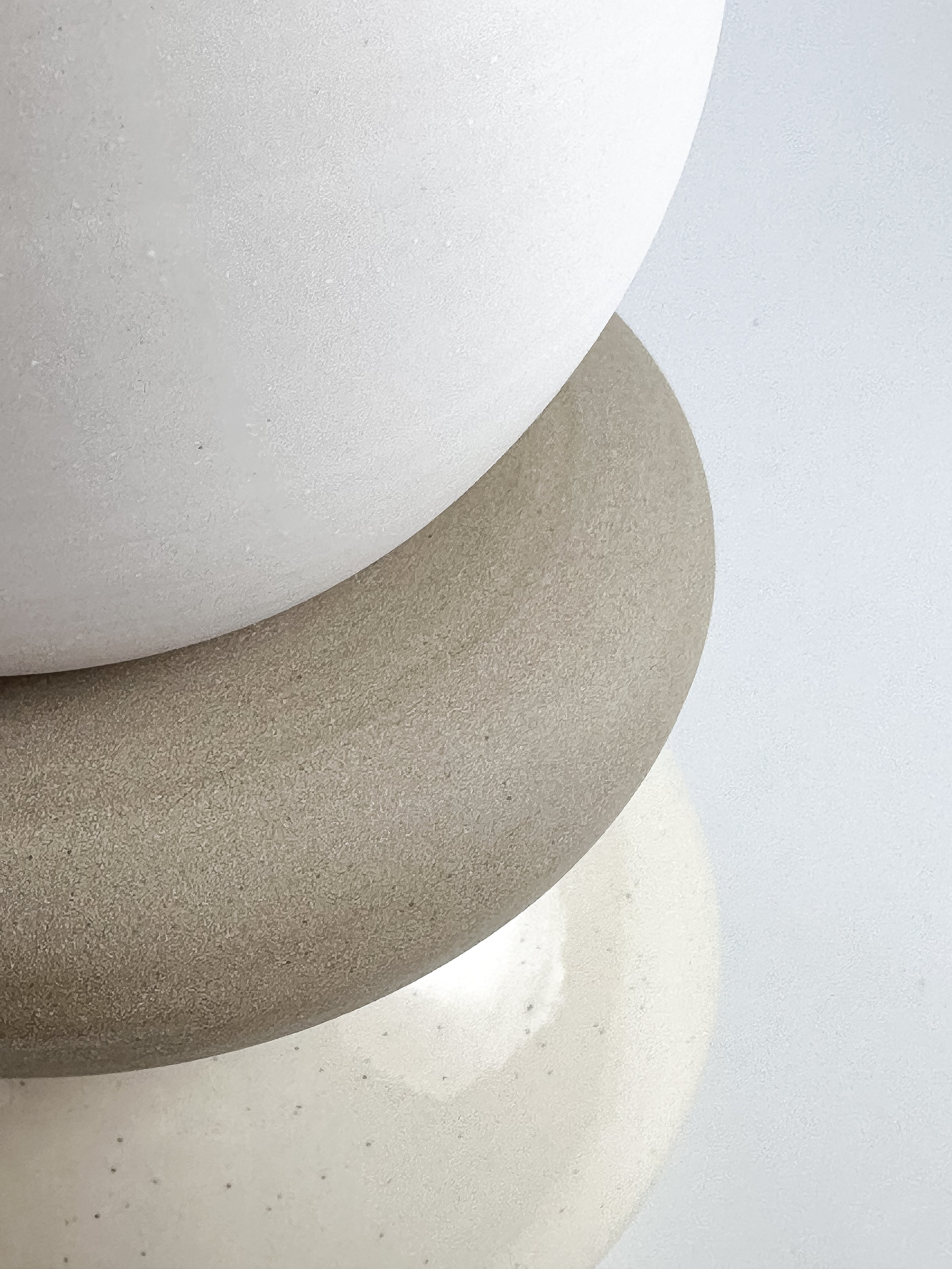 A sculptural handmade stoneware table lamp in gloss white and natural tan. The ORB features a porcelain shade that emits a distinctive, inviting glow when illuminated. It’s perfect as an accent lamp, for reading, on a bedside table, or anywhere that could use warm, beautiful ambient lighting.